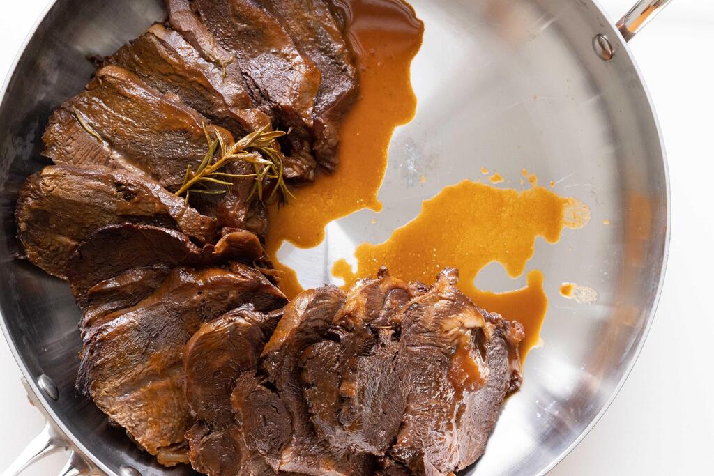 מוציאים את נתח הבשר ומקררים היטב לפחות כשעתיים בקירור ופורסים לפרוסות דקות של 1 ס"מ. שומרים בקירור להגשה. את הנוזלים שבסיר מסננים ומצמצמים מעט במידת הצורך לרוטב סמיך. בהגשה מסדרים את פרוסות הבקר בסיר או בתבנית, מחממים את הרוטב ומוזגים על הבשר, ומבשלים בחום נמוך כחצי שעה נוספת.